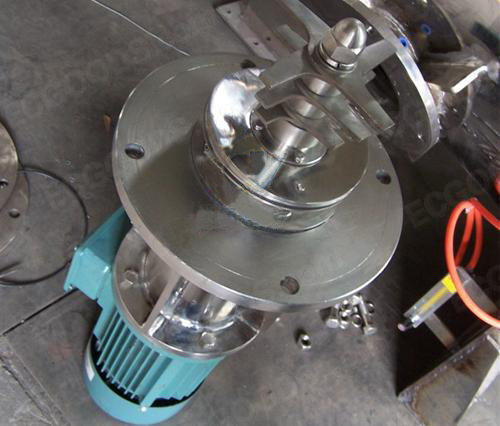 高速飞刀安装于犁刀混合机筒侧向下45度角,刀头伸入筒内,在搅拌时,物料受犁刀驱赶至飞刀有效范围,受飞刀高速剪切。